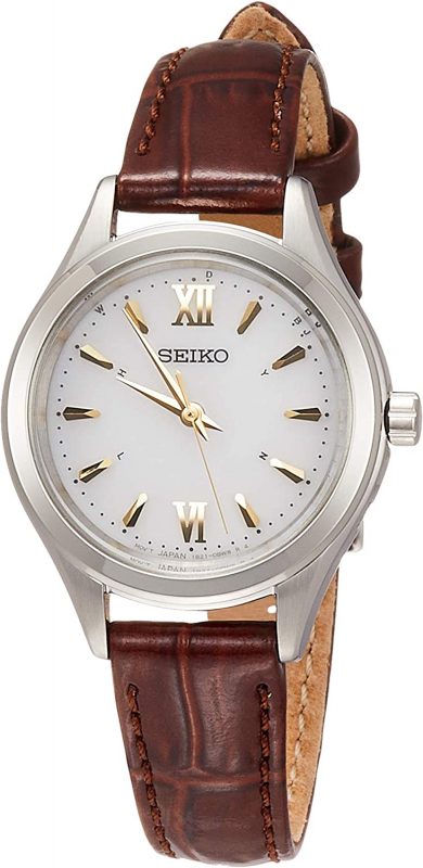 ブラウンレザーのストラップを持つこのモデルは、落ち着いた雰囲気があり、大人の女性に最適です。ストラップは簡単に交換でき、見た目も楽しめます。