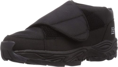 靴紐のない、カジュアルな厚底黒スニーカー。大きな面ファスナーを使っており、留める位置でフィット感を調整できます。靴紐タイプのスニーカーよりも、カジュアルな雰囲気を楽しめるのが特徴です。