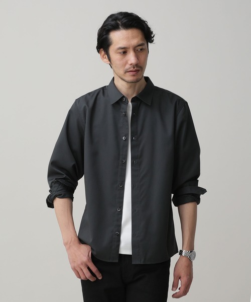 上品な印象のあるTR素材を取り入れ、落ち着いた雰囲気に仕上げたアイテムです。黒シャツの上にベストやカーディガンを重ねて着るスタイルもおしゃれになります。カジュアルからビジネスまで、あらゆるシーンで使える黒シャツをお探しの方におすすめです。