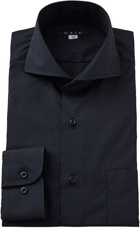 カジュアルからフォーマルまで対応するセミワイドカラーの黒シャツです。特殊な形態安定加工により、ノンアイロン仕様で洗濯してもシワがつきにくく、手入れも簡単です。
