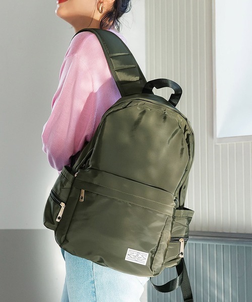 フロントにはファスナーポケットが2つ備えられており、鍵やお財布などのすぐに取り出したいアイテムを収納するのに便利です。また、サイドポケットにはペットボトルや折りたたみ傘を収納することができます。カジュアルなスタイルを好む女子大学生におすすめです。