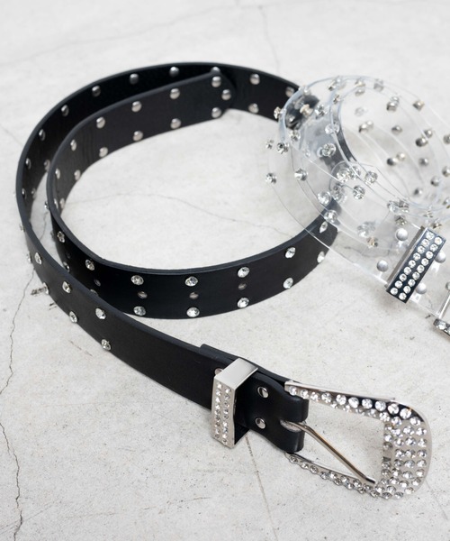 バックルやベルト全体にビジューを散りばめた、キラキラ感が楽しめるレディースベルト。ロック系などのハードスタイルはもちろん、シンプルなコーディネートにもアクセントを加えることができます。存在感があるため、シンプルな無地のアイテムと組み合わせることをおすすめします。