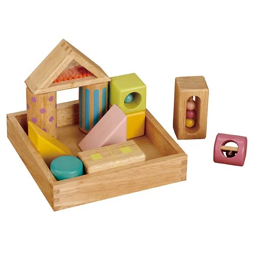 積み上げるだけでなくアクリルの積み木越しに景色を見回してみたり、動物が描かれた積み木を使用してごっこ遊びをしてみたり、自由に遊べるのがポイント。積み木を収納できる家型のボックスも、絵柄合わせなどの遊びに取り入れられます。
