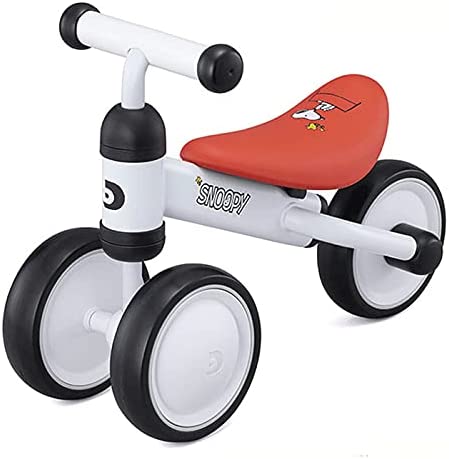「スヌーピー」がデザインされた室内で遊べる乗り物玩具です。前輪が2輪、後輪が1輪のタイヤが特徴。前輪は、子供が前に体重をかけたときに転びにくいような作りです。後輪は、子供が床を蹴ったときに、足にタイヤが当たらないような仕様。三輪車より安定感があり、乗り降りの練習がしやすいと謳われています。