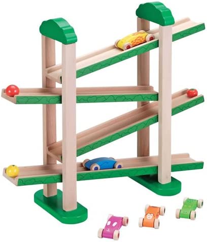 スロープを車が滑り降りるシンプルなおもちゃです。車に描かれているのは、ぞう・さる・キリン・うさぎ・ワニの5種類の動物たち。スロープを折り返すたびに、木製のおもちゃの心地よい音が楽しめます。スロープも白木からできているのが特徴。あたたかみのある木のデザインは、インテリアにも馴染みます。