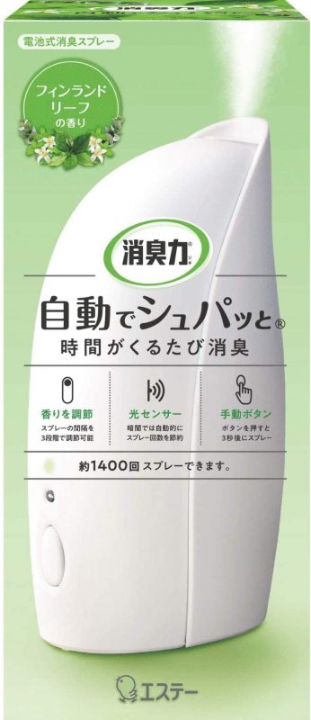 また、手動でスプレーすることもできるほか、部屋が暗くなるとセンサーが反応し、自動的にスプレーする回数を減らすのもメリット。効率よく使用できる置き型消臭剤です。