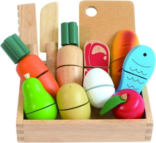 野菜の断面には面ファスナーを使用しています。面ファスナーの特徴である厚みにより、包丁を簡単に入れることができます。また、リアルな切り心地を感じることもできます。セットには、包丁2本、まな板1枚、食材9点、収納木箱の13点が含まれています。