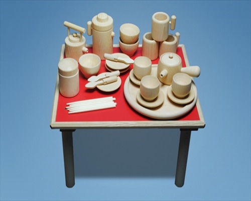 食器やカトラリーが揃った2歳の女の子へのプレゼント。通常の食卓で使用する食器などが含まれているのが特徴です。木製品で、ブナやせんの木などを加工して作られています。お茶を入れるための茶筒や急須、湯のみなどの道具、食事に使用する茶碗や箸、スプーンなど、合計26点のセットです。