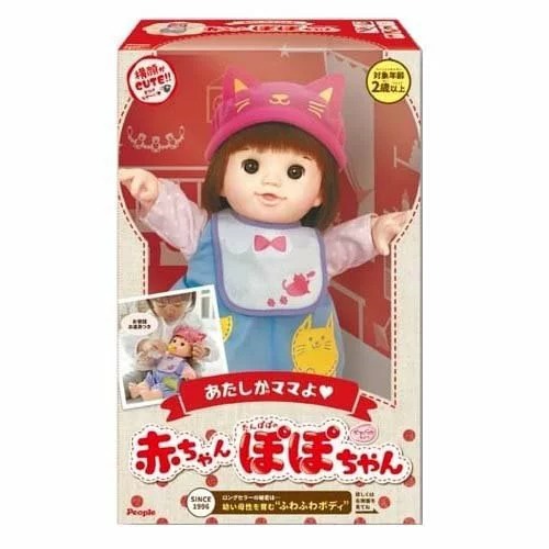 赤ちゃん「ぽぽちゃん」のお世話ができる2歳の女の子へのプレゼント。人間の赤ちゃんに近づける工夫が施されているのが特徴です。おなか・お尻はぬいぐるみに似た触り心地になっています。特別な素材を使用して、ほっぺや手は実際の赤ちゃんの肌に似た感触になっています。体を横に寝かせると目を閉じます。