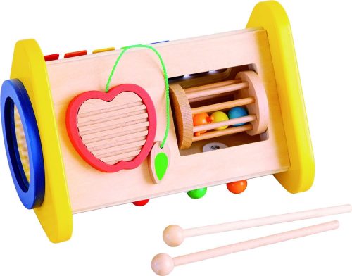 次のように書き直してください。 5つの異なる音を楽しめるプレゼントです。ドラム、シロフォン、ギロ、ラトル、歯車が付いた木製のおもちゃで、たたいたり回したりこすったりするなど、さまざまな動きで音を出すことができます。対象年齢は2歳以上で、音を自分で出すことで音感を自然に養うことができます。