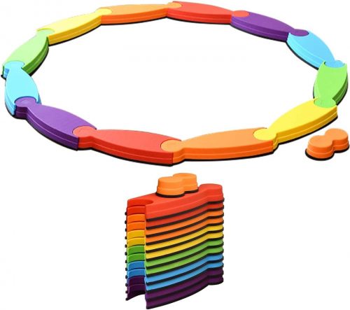 全パーツを直線状に結合した場合の長さは376cmで、円形に結合した場合の直径は125cmです。収納時のサイズは幅36×奥行12×高さ35,5cmで、体幹・バランス・集中力・注意力など、さまざまな能力を鍛えるための2歳の女の子へのプレゼントです。