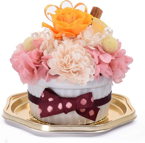 プリザーブドフラワーを、ケーキ風にデコレーションした就職祝いのプレゼントです。使用している花は、バラやアジサイ。優しい香りのシナモンスティックと、フルーツピックで仕上げています。