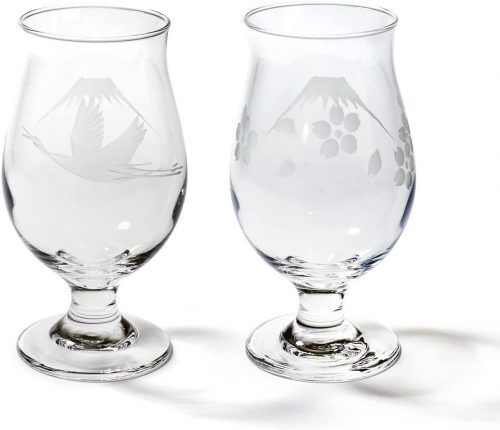「富士山と鶴の文様」「富士山と桜の文様」が施された、江戸切子のペアグラスです。ソーダガラスで作られたビアグラスに、花切子の技術で富士山と鶴・桜をカットしてあります。日常のさまざまな場面で使用したくなる製品です。