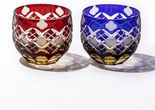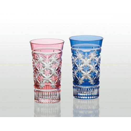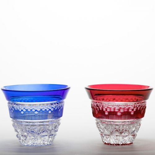 「重ね矢来」と「菊底」の文様を施した、江戸切子のペアグラスです。カラーは江戸切子ならではの赤色とルリ色で、タンブラーとしてさまざまな用途に使用可能。ガラス吹き技法で作った色被せガラスを、切子師が丁寧にひとつひとつカットしています。