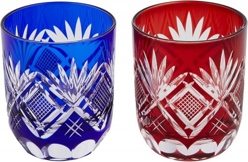 「笹の葉」と「四角籠目」の文様を施した、江戸切子のペアグラスです。クリスタルガラスで製造され、カラーは江戸切子のスタンダードな赤と青。クラシックなデザインのカットで、伝統的な美しさを持つロックグラスに仕上げています。