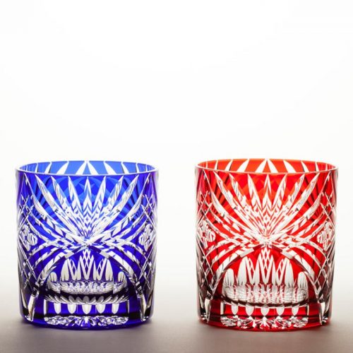 「矢来」と「笹の葉」の文様を施した、江戸切子のペアグラスはこちらです。カラーは、江戸切子特有の赤と青を使用しています。ウイスキーやカクテルを楽しむのに最適なオールドグラスとして仕上げました。