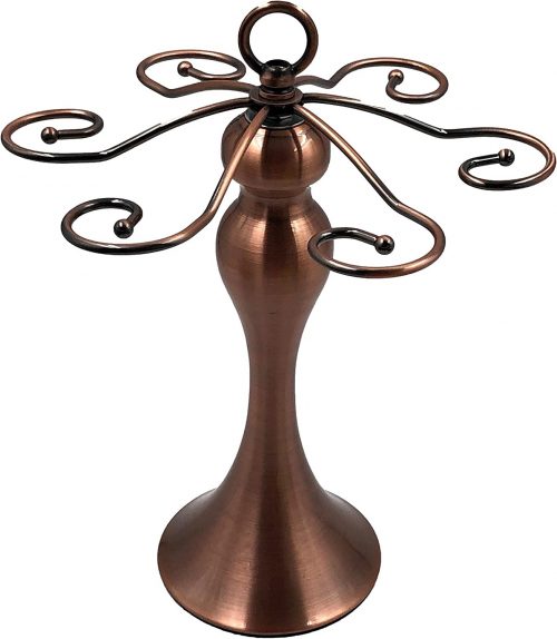 アンティーク風の色合いとデザインが目を惹くスタンド式ワイングラスホルダーです。中央スタンドはくびれたシャープなラインが特徴で、上部にはG字型のフックデザインがあります。美しい光沢のあるブラウンカラーで、置くだけでおしゃれな雰囲気になります。