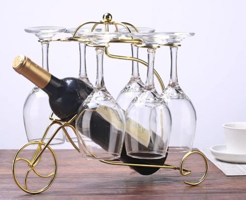 自転車を基に製作されたスタイリッシュなワイングラスホルダー。ヴィンテージで上品なデザインが目を引き、ディスプレイにも適したアイテムです。