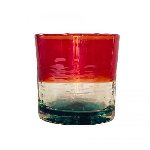 残波岬から見える夕日と海を思い浮かべながら作られたロックグラスです。グラスの上部に鮮やかなグラデーションを施すことで、時間が経つにつれて空が赤紫色に変わっていく様子を表現しています。美しい夕日が沖縄の青い海に沈んでいく様子を琉球ガラスで表現しています。