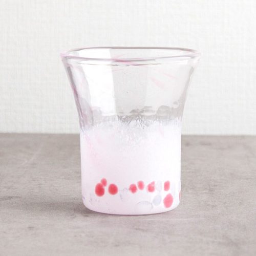 琉球ガラスのぐい呑みです。コップ全体には雲のような白い模様が散りばめられています。飲み口はハートの形をしており、特に注目ポイントです。ドレッシングを入れて食卓を華やかに彩ったり、シロップを入れてデザートを楽しむのもおすすめです。