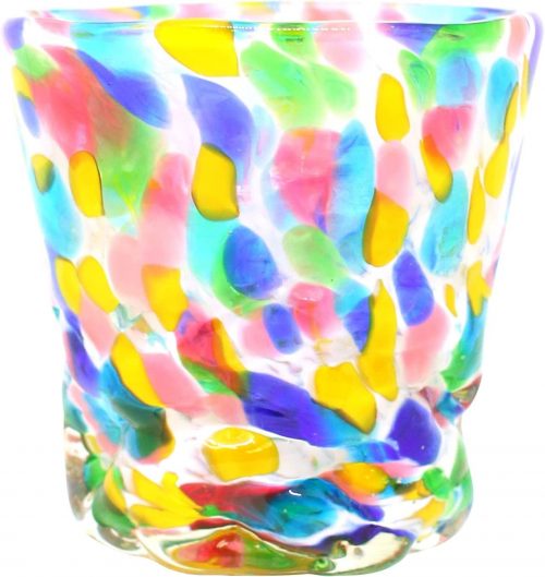 カラフルな琉球ガラスのグラスです。水の中で様々な色合いの絵の具を溶かしたような、華やかな印象を与えます。幻想的なカラーリングと、西洋を思わせるモダンな形状が魅力です。手の小さな方でも持ちやすく、非常に人気があります。サイズは高さ約80mm×口径約80mm。容量は約200mlです。