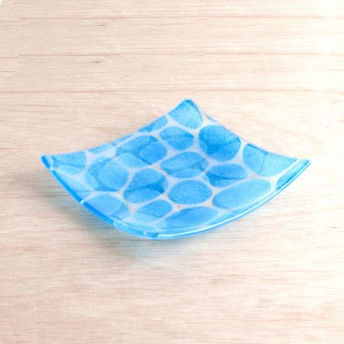 沖縄の海を思い浮かべながら作られた皿です。沖縄の海は光の当たり具合や季節によって変化する美しい景色ですが、この皿では琉球ガラスを使ってその表現をしました。水面に光が当たった時に見せる揺らめく複雑な形を模したデザインが特徴で、透明ガラスに色を重ねて焼き付けています。