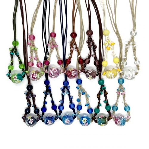 琉球ガラスで製作されたとんぼ玉のペンダントです。とんぼ玉の内部には、目を引くプルメリアの花が見られます。カジュアルな雰囲気を持つワックスコードを使用しており、調節可能なフリーサイズで最大約70cmまで対応できます。