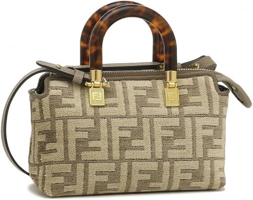 本体の素材には総柄のモノグラム生地を使用しています。一目でフェンディとわかるアイコニックなデザインが魅力的です。また、べっ甲柄のプレキシガラスを採用したハンドルも目を引きます。