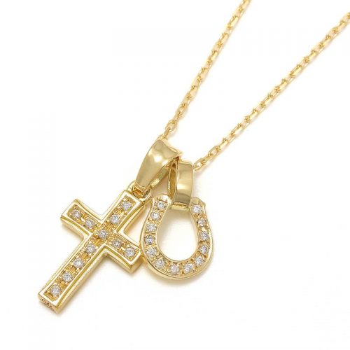 ダイヤモンドが散りばめられたクロスとホースシューモチーフを組み合わせたゴールドネックレス。華やかで豪華な存在感を放ち、コーディネートを一瞬で明るく彩りたいときにおすすめです。