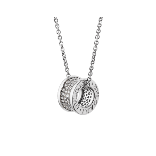 ブランドの象徴的な「ビーゼロワン」のネックレスは、ローマの円形競技場からインスピレーションを受けて作られており、立体的なデザインが特徴です。エレガントなホワイトゴールドがメインで使用されており、らせん部分にはダイヤモンドが敷き詰められた豪華なデザインが魅力的です。