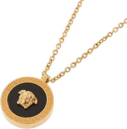 メデューサが配置されたラウンドパーツの高級感漂うネックレスです。ブランドを象徴するグレカ柄の刻印とエナメルディテールが組み合わされた豪華なデザインが魅力です。適度なサイズ感で目立ちすぎず、幅広いコーディネートにマッチします。