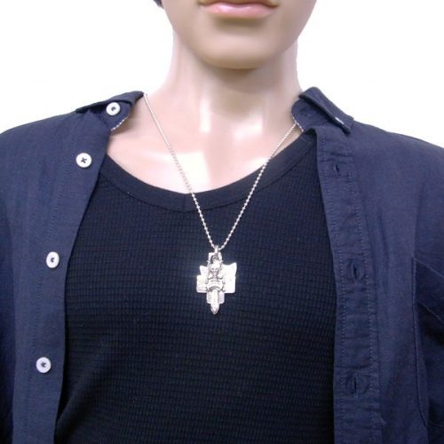 ブランドのアイコニックなダガーとクロス、プレートを組み合わせたシルバーネックレスです。3つのアイテムが動くたびに揺れて胸元のスタイリッシュなアクセントになります。装着するだけでカッコいい印象を演出します。