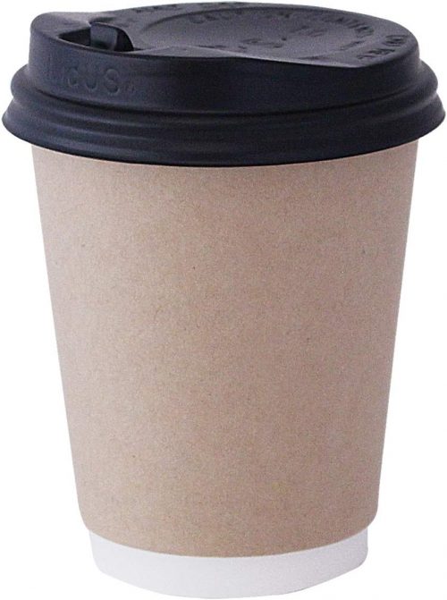 ナチュラルな印象のクラフト紙を使った蓋付き紙コップです。カップの外側に厚いクラフト紙を巻いた二重構造で、内側のコップとの間にできる空気層により、熱が手に伝わりにくくなると言われています。