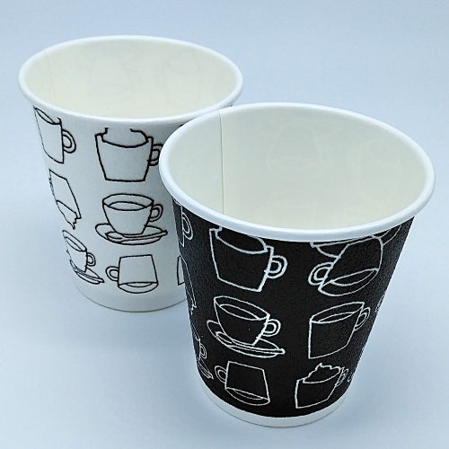ラテアートをテーマにしたおしゃれなデザインの蓋つき紙コップ。普通の紙コップに凹凸のある厚紙を巻いた断熱エンボス紙コップで、温かい飲み物を楽しむのに最適です。
