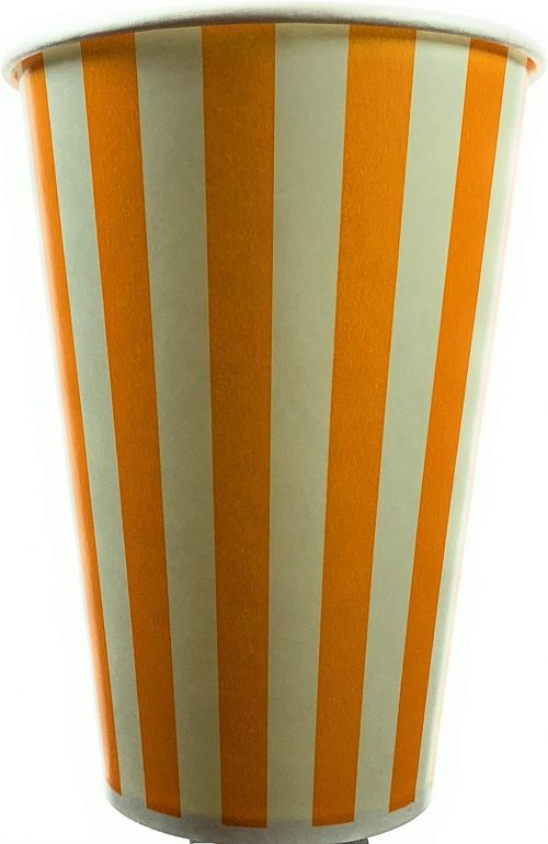 オレンジのストライプが目を引く紙コップ。シンプルでありながらポップなデザインでお祭りなどのイベントやレジャーに最適です。ホットとコールドの両方に対応しています。