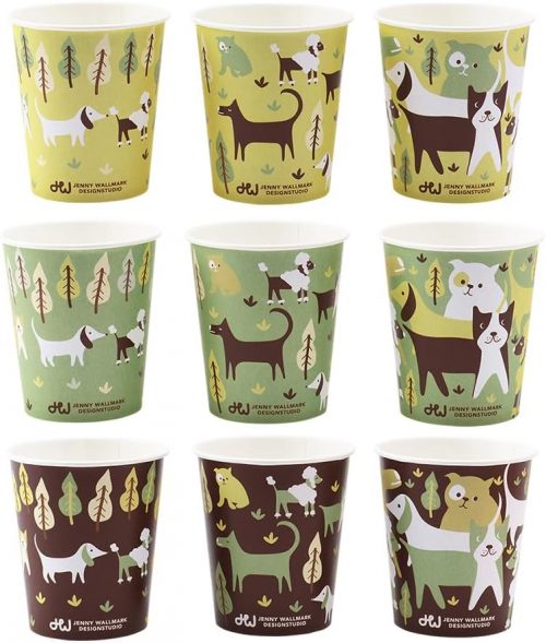 さまざまな種類の犬や森が描かれている小さめの紙コップ。アソートパックには9種類のカラーとデザインが入っており、ホットとコールド兼用でさまざまな用途に使用できます。