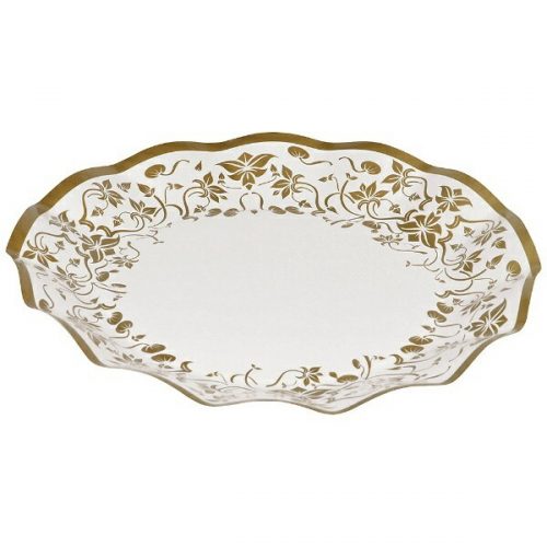 おしゃれな紙皿が、落ち着いたパーティーシーンで活躍します。側面にはエレガントなデザインが描かれており、草花に加えて縁をかたどる線が高級感を演出しています。通常の丸皿とは違い、ウェーブ状の形状が華やかさを特徴としています。