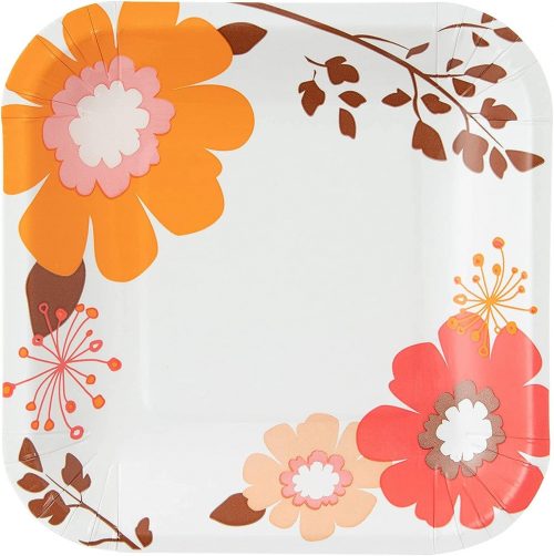 派手な花柄のデザインが特徴的な紙皿です。大きな花が描かれているのがポイントです。オレンジ、赤、ピンクなど、暖色系の色味だけを使用したデザインで、統一感があります。15×15cmのスクエアタイプで、オードブルの取り皿に最適です。手軽につまめる料理がバランスよく盛り付けられます。