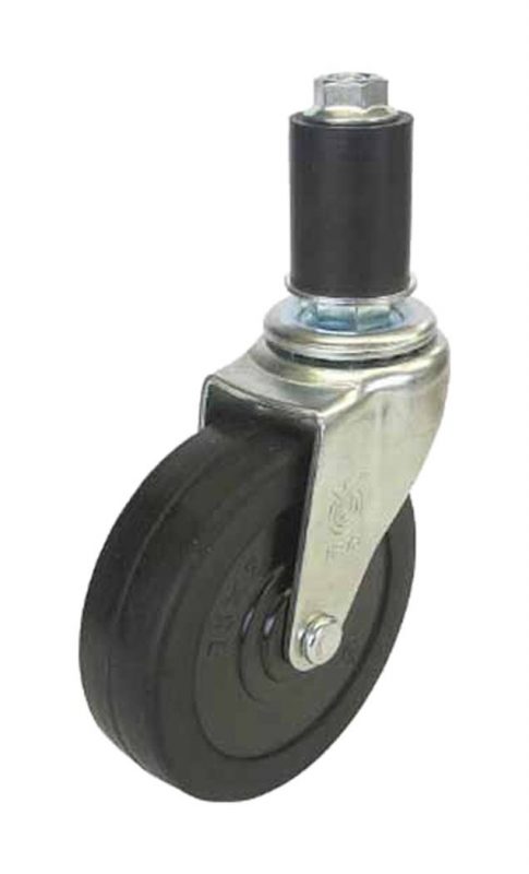 ゴム素材の車輪を使った、挿入タイプ・プラグ型のキャスターです。凹凸のある場所でもスムーズに移動できるのが特徴です。耐荷重はキャスター1個あたり最大40kgまで可能です。