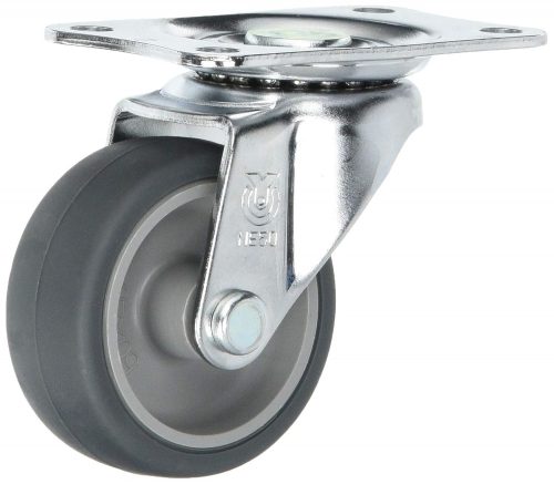 エラストマー素材の車輪を利用したプレートタイプのキャスターです。エラストマーの車輪は、床に跡を残しにくく、柔らかい素材のため、振動を吸収して静かに走行します。