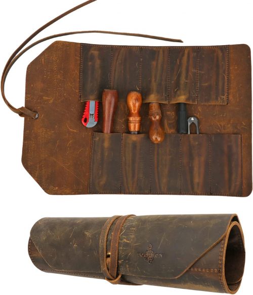 革製のツールバッグです。ロールアップタイプのスタイリッシュな工具入れが欲しい方におすすめです。また、プレゼントにも最適です。耐久性があり、長期間にわたって使用することができるアイテムです。