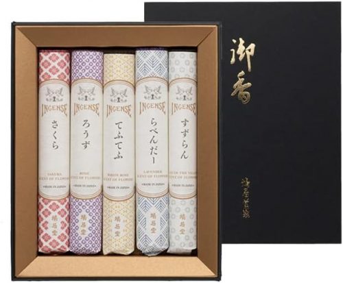 かわいらしい巻紙が目を引くおしゃれな線香。桜やラベンダーなどの花の香りをテーマに、5種類の線香が含まれています。