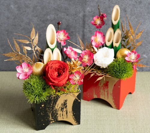 乾燥させた竹の他に、松や椿の人工の花を使用します。これにより、美しい状態を長期間維持することができます。玄関に飾ることで、新年の祝福の雰囲気が一層高まります。