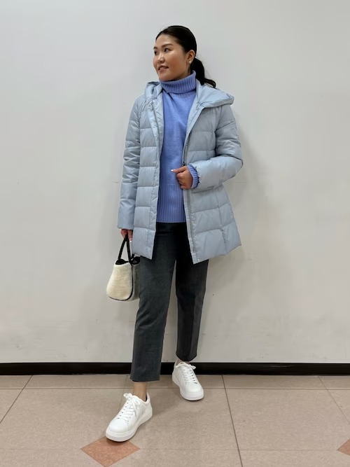 トップス・アウターをさわやかなブルーで統一した、スタイリッシュな服装。ダウンコートでしっかり防寒をした、最高気温11度の雨の日におすすめの着こなしです。