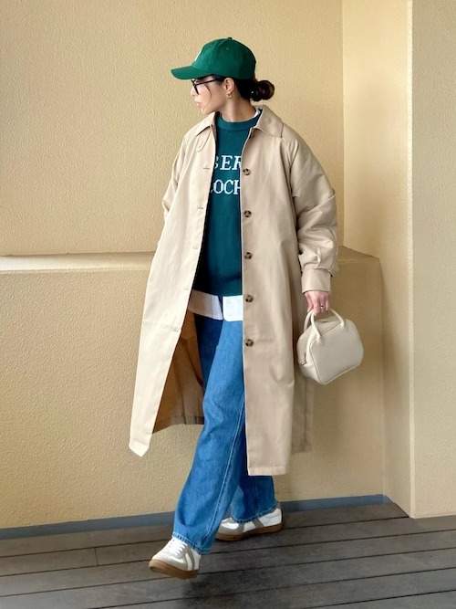 かっちりとしたステンカラーコートを主役にした、メンズライクコーデです。ベージュとグリーンを基調にした、カジュアルでおしゃれな色合いがポイント。グリーンはさまざまな色と合わせやすいので、色物初心者の方にもおすすめの服装です。