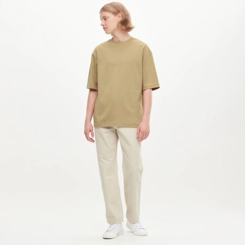 オーバーサイズTシャツをモダンに着こなしたいときにおすすめのメンズコーデ。くすみグリーンのオーバーサイズTシャツを主役に、黒のスラックスで落ち着いた着こなしに仕上げています。