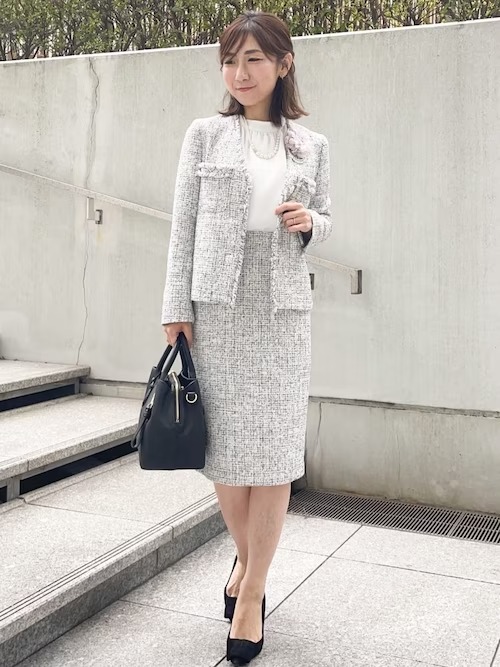 華やかなフリンジデザインのツイードセットアップを取り入れた伝統的な入学式・入園式のコーディネートです。きちんと感と華やかさを同時に表現できるツイードセットアップは、40代のママに最適です。明るいグレーを選べば、春らしさも演出できます。