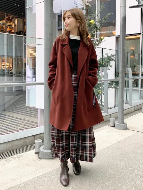 チェスターコートを着て、最高気温が15度の時期におすすめの服装です。チェスターコートの色は濃いブラウンで、秋らしい雰囲気を演出しています。ボトムスはチェック柄のスカートを選んで、チェスターコートと同じ色がちらりと見えるのがおしゃれです。