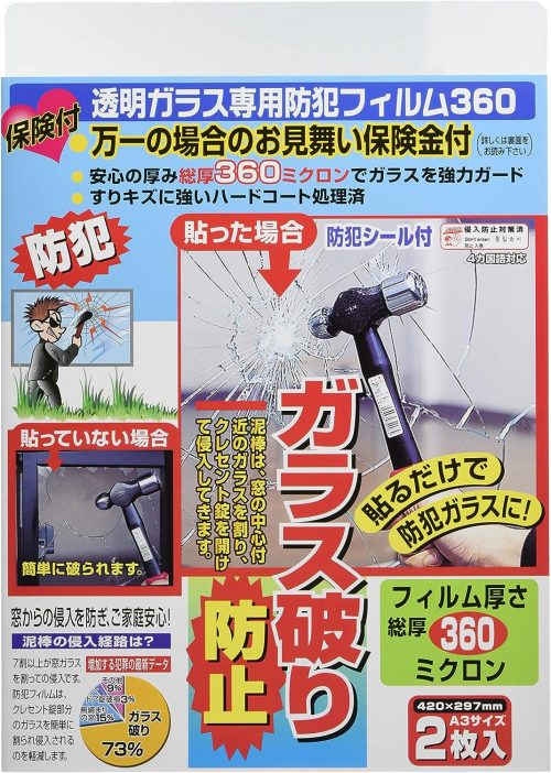 窓の割れにくさを向上させるための防犯グッズです。フィルムは複数の層で構成されており、耐久性に優れています。また、ハードコート処理により擦り傷にも強く、傷にも耐える仕様となっています。頑丈な防犯フィルムを探している方にはおすすめです。