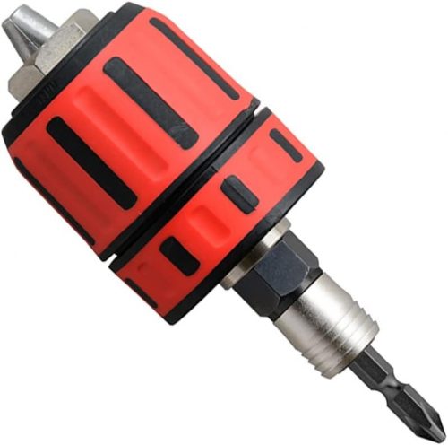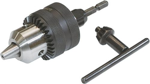 芯ブレが少ない上に耐久性の高い6.35mmの六角シャンク部を使用したドリルチャックです。シャンク圧入方式を採用しており、軸折れに強く、電動ドリルやインパクトドライバーで使用することができます。チャックキーが付属しており、しっかりと先端工具を固定することができるのが特徴です。
